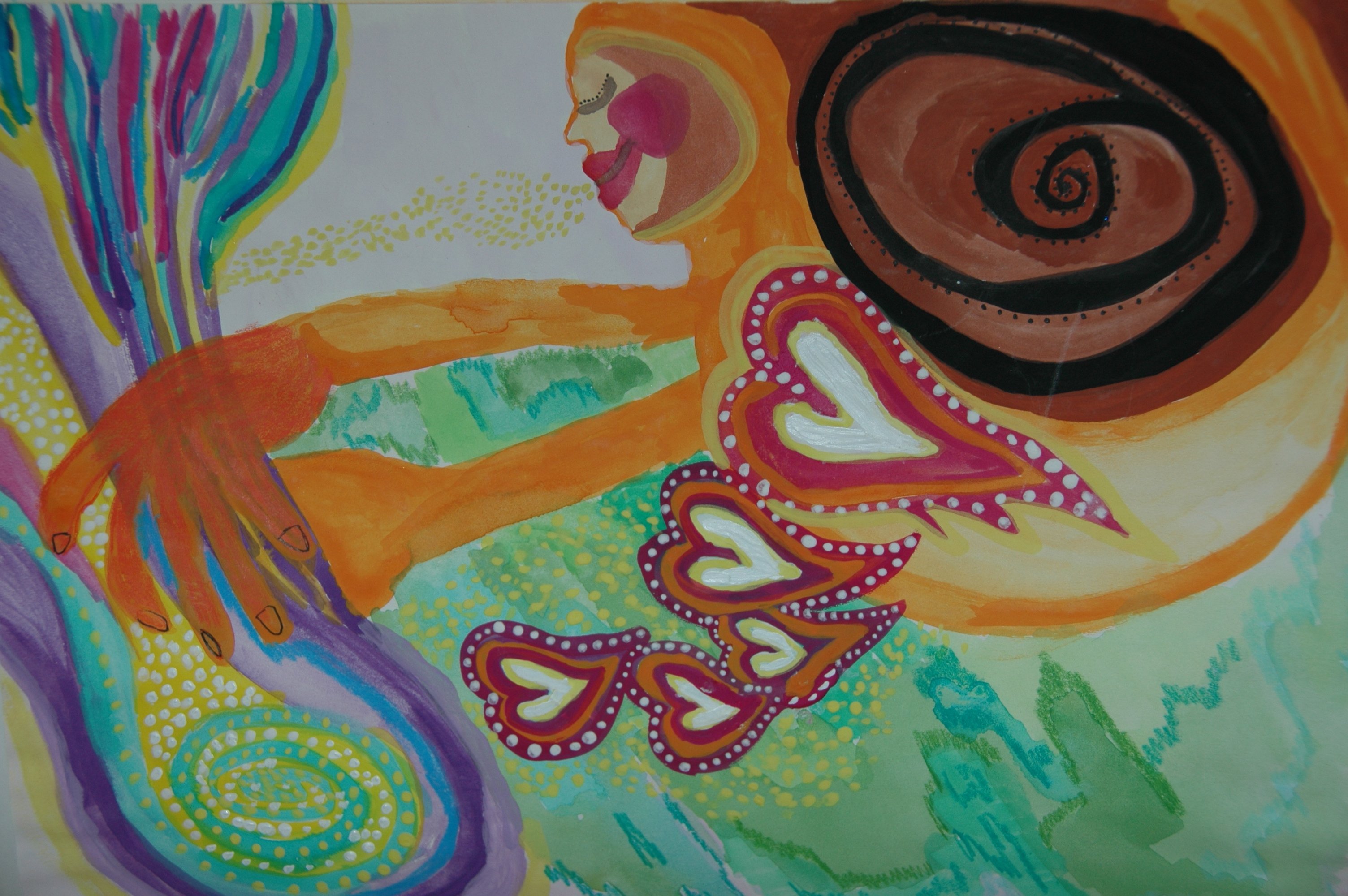 Today I played around with watercolors in my sketchbook. What showed up is another one of those images that is puzzling to me on a lot of different levels. Although its certainly not the first time THAT has ever happened! I’ve been going through some serious dental trauma the past month ….. lots of dental surgeries, lots of pain, lots of limitations… and I’ve actually been kind of depressed. Feeling old. Feeling powerless around GETTING older and missing my younger body. Grieving for that time in my life when other things might have been hard but I wasn’t dealing with so much in terms of PHYSICAL limitations.