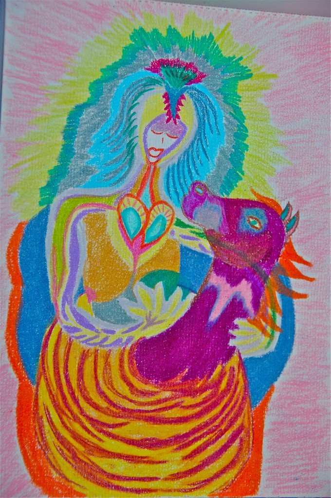 It gave her tremendous energy to paint them. She felt alive and on fire as they came out of her brush. The messages that she was getting from the painting were very straightforward. Paint some green teeth. Now it needs blue and purple squiggles going down it’s back. Now it needs another eye. OK. Stop now. No more eyes.